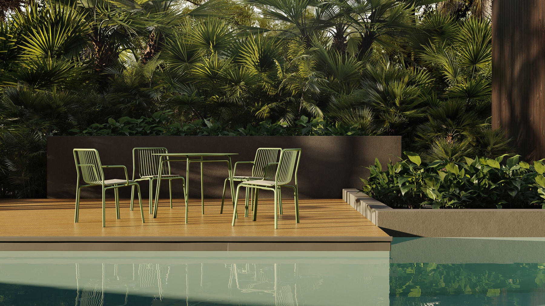 The different elements of the N12 collection are conceived as a mixture of tubular aluminium profiles and wire rods that intersect at points just like how wicker furniture is made. The beauty of the structure and framework mesh is projected on the ground beneath creating an attractive pattern of shadows.