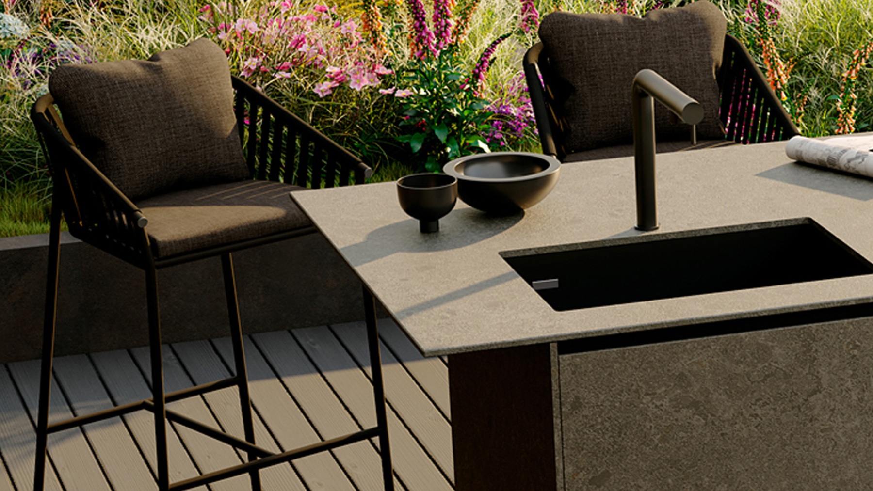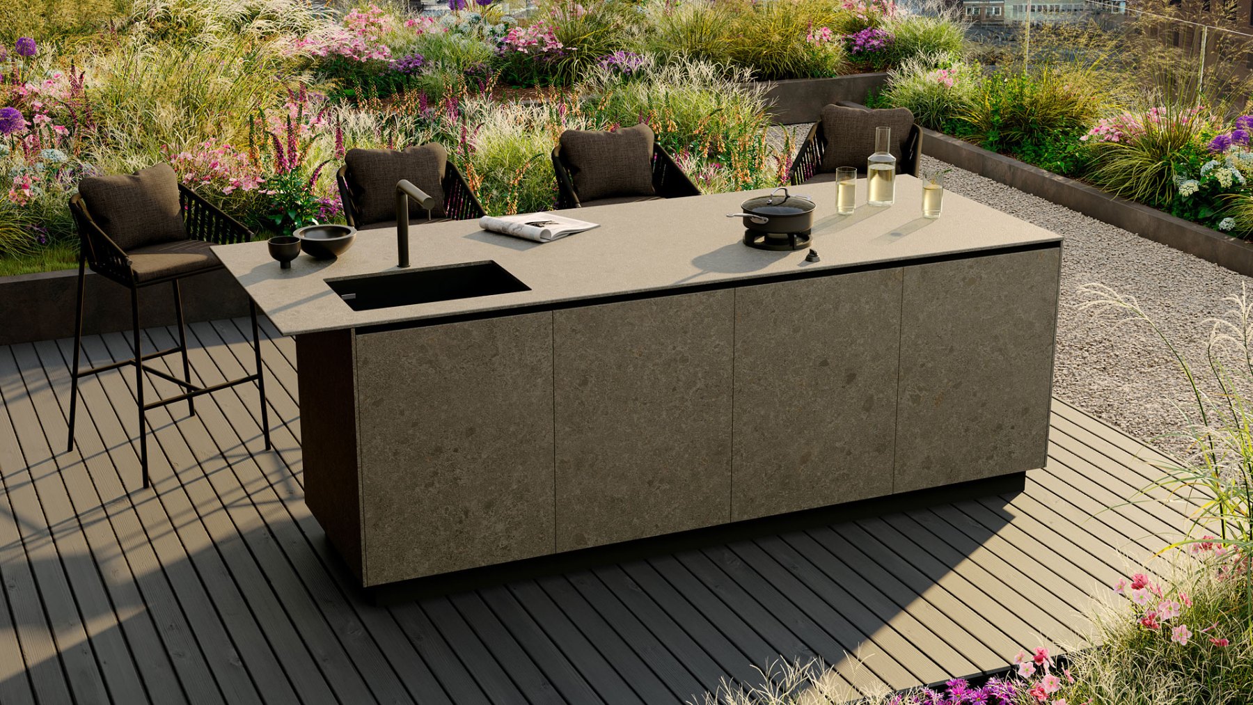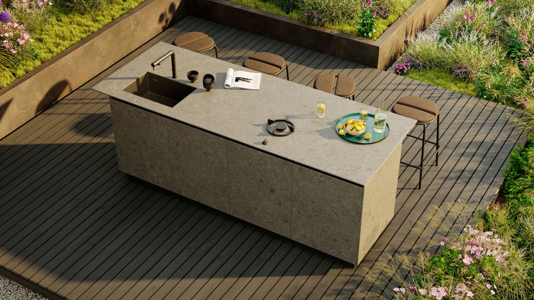 design inspired by the looks and finishes normally found with indoor models. They can be configured along the lines of a conventional wall hung model (the One Side series) or free standing (Island series) with a partially cantilevered worktop that works like a bar counter. The collection includes tour types of storage modules, under sink unit and one accommodating a gas cylinder for the hob burner. Combined with the accessories: PITT gas burner, sink, tap and 132 Lt capacity fridge with integrated panel door,