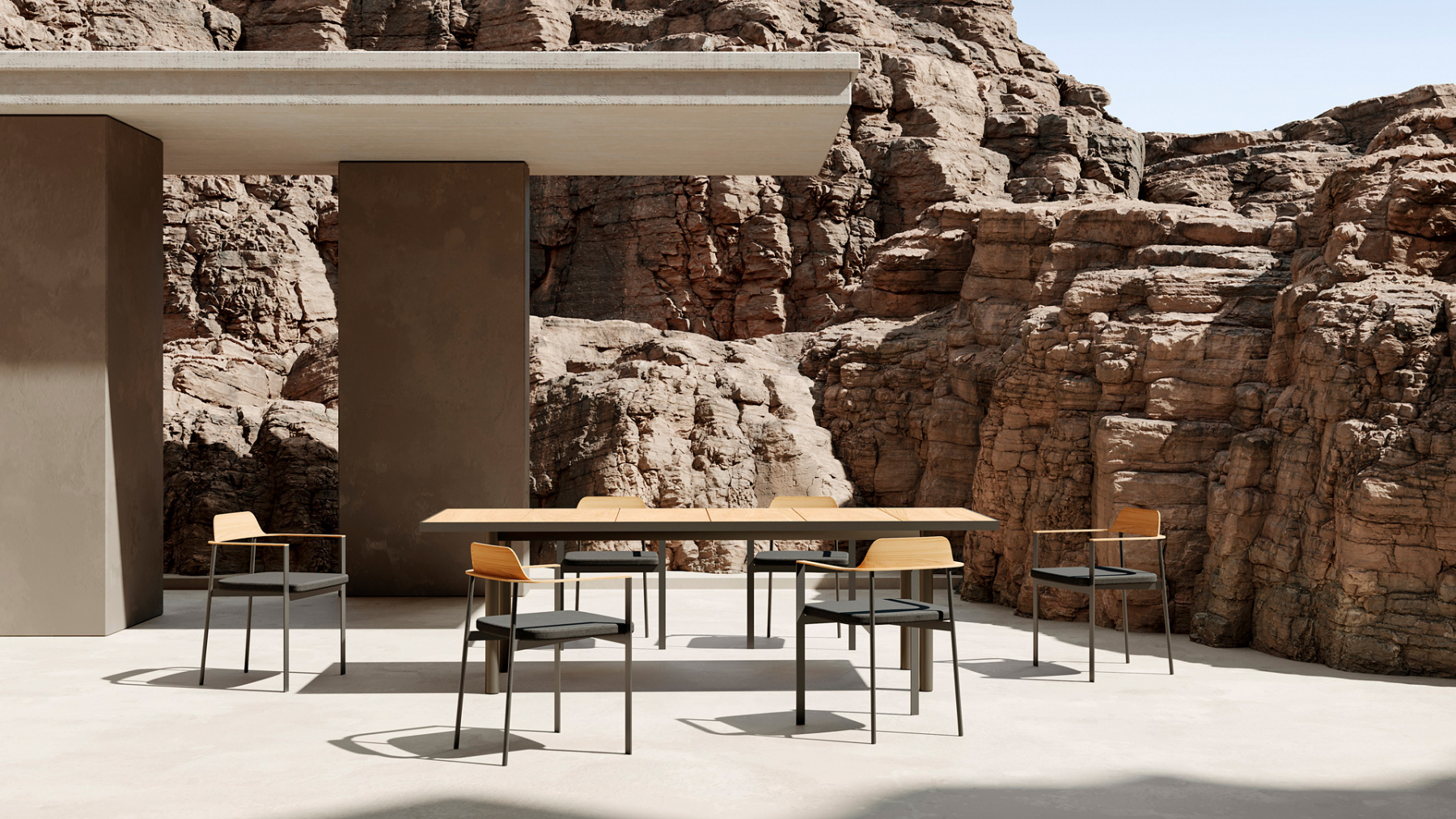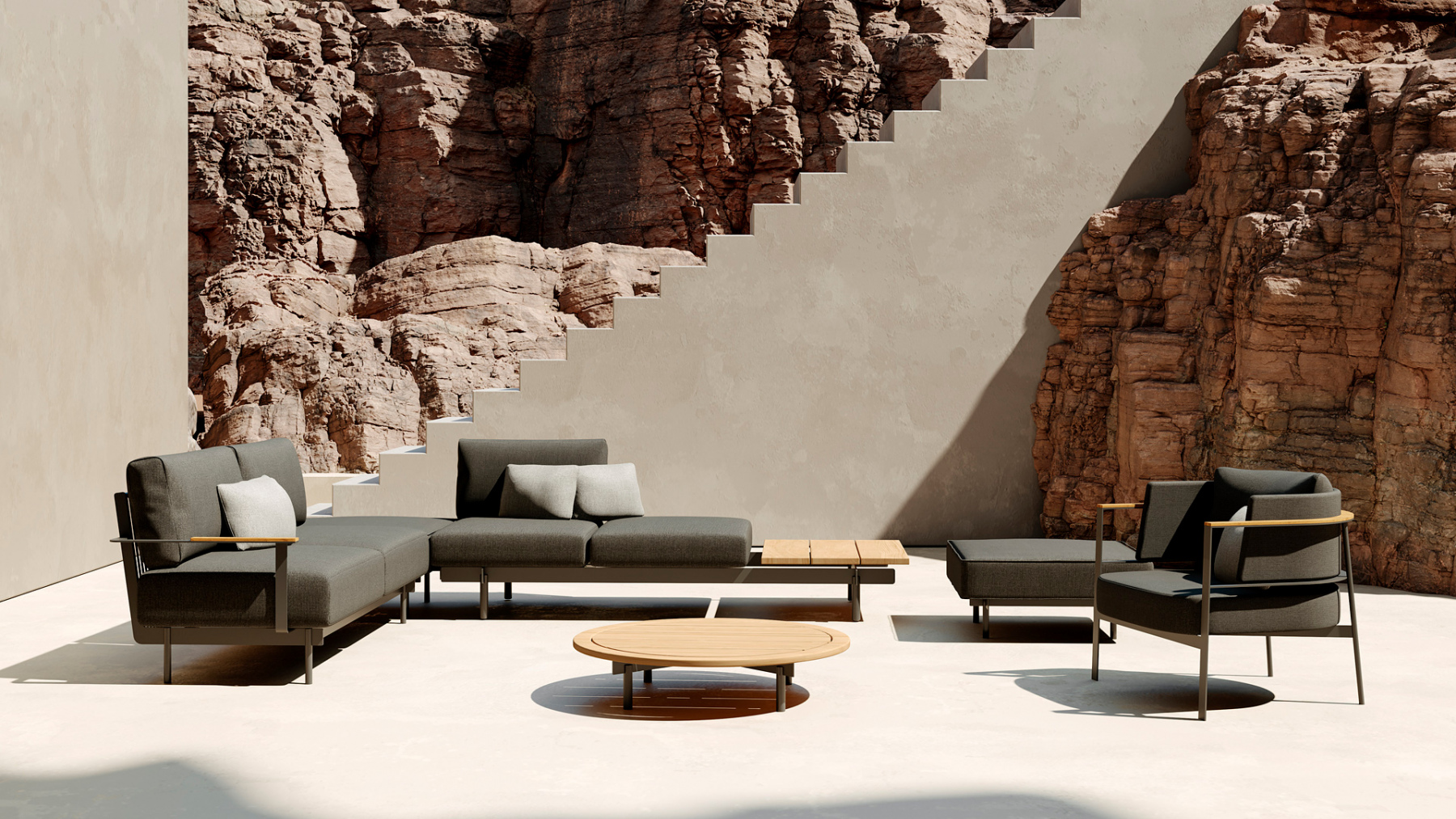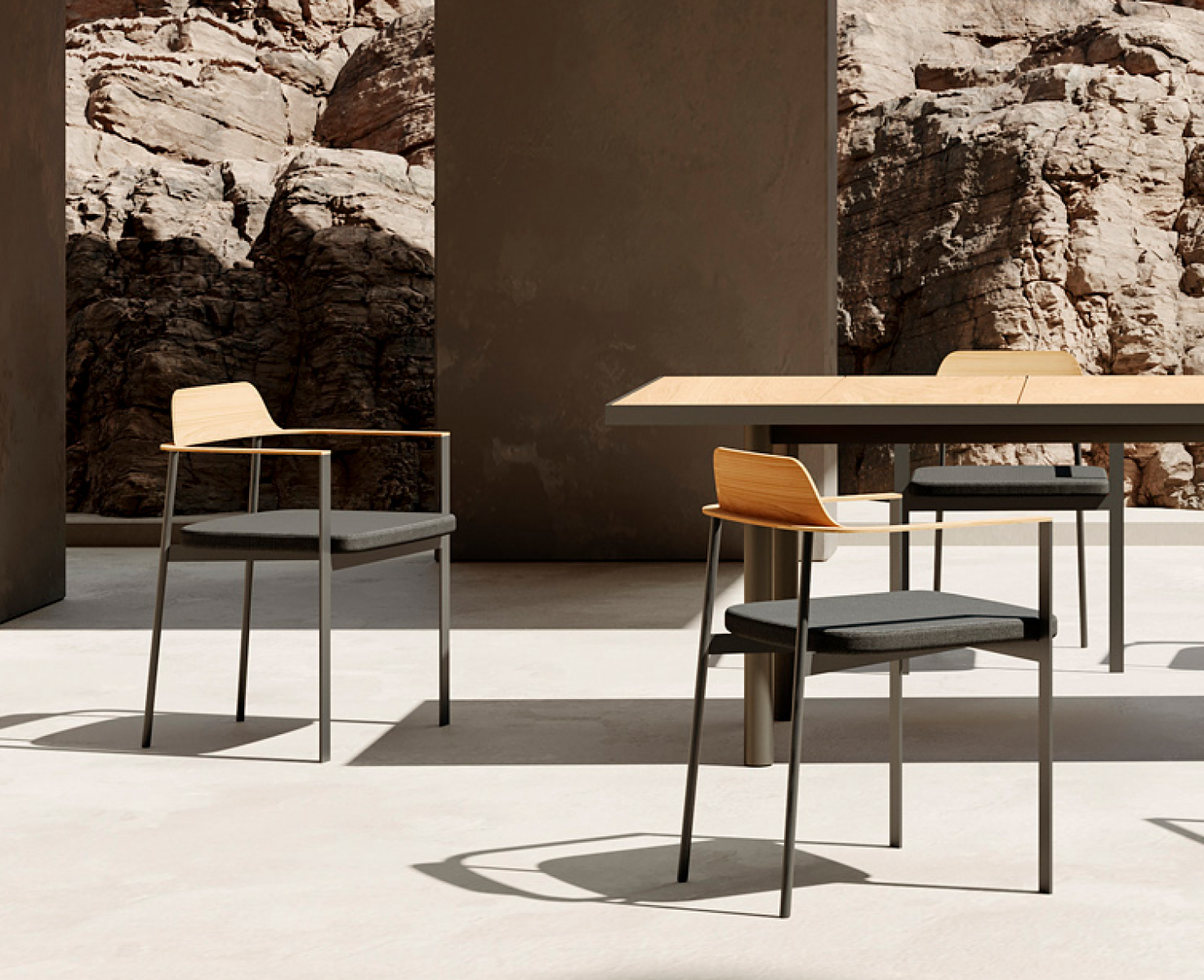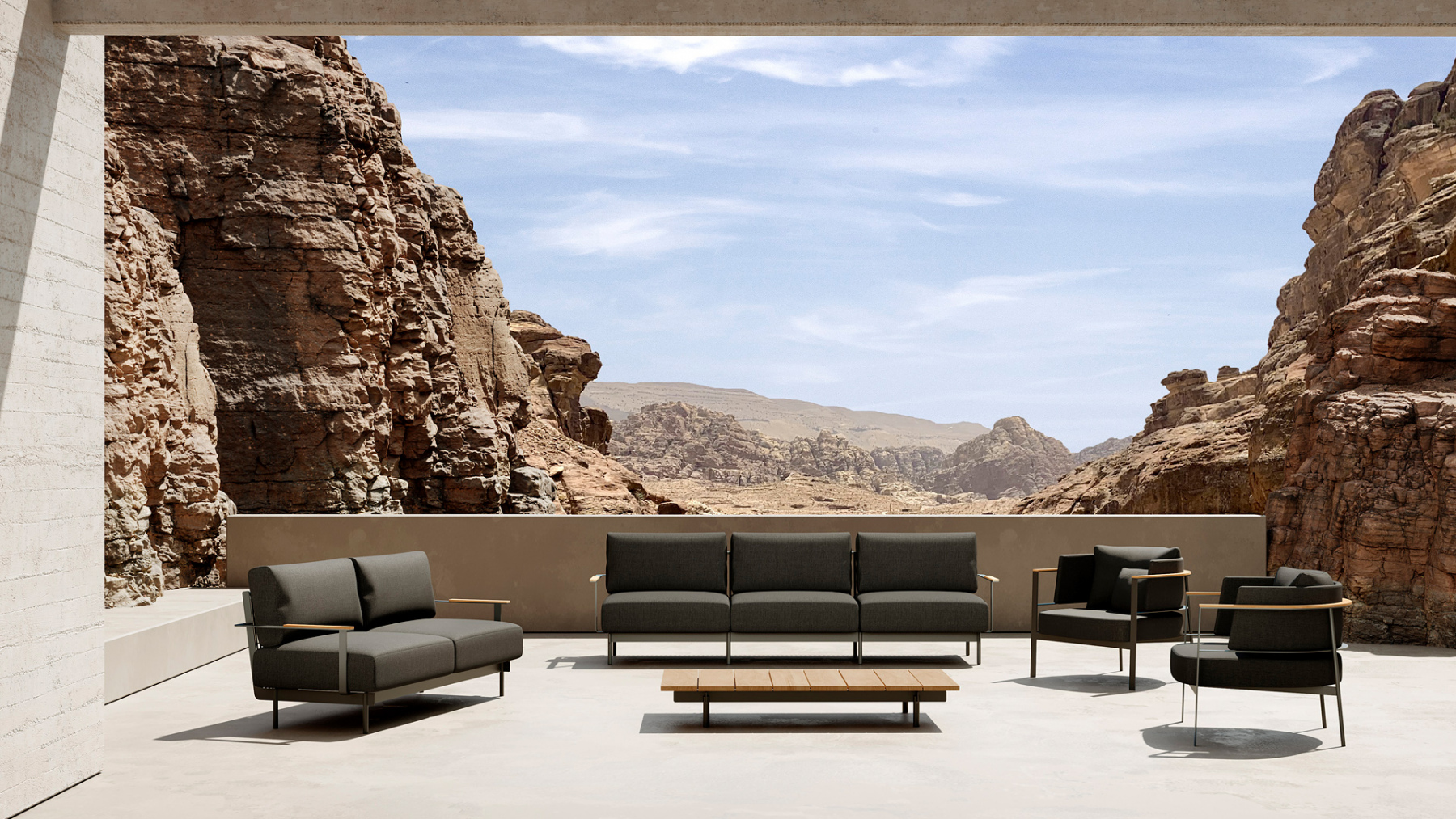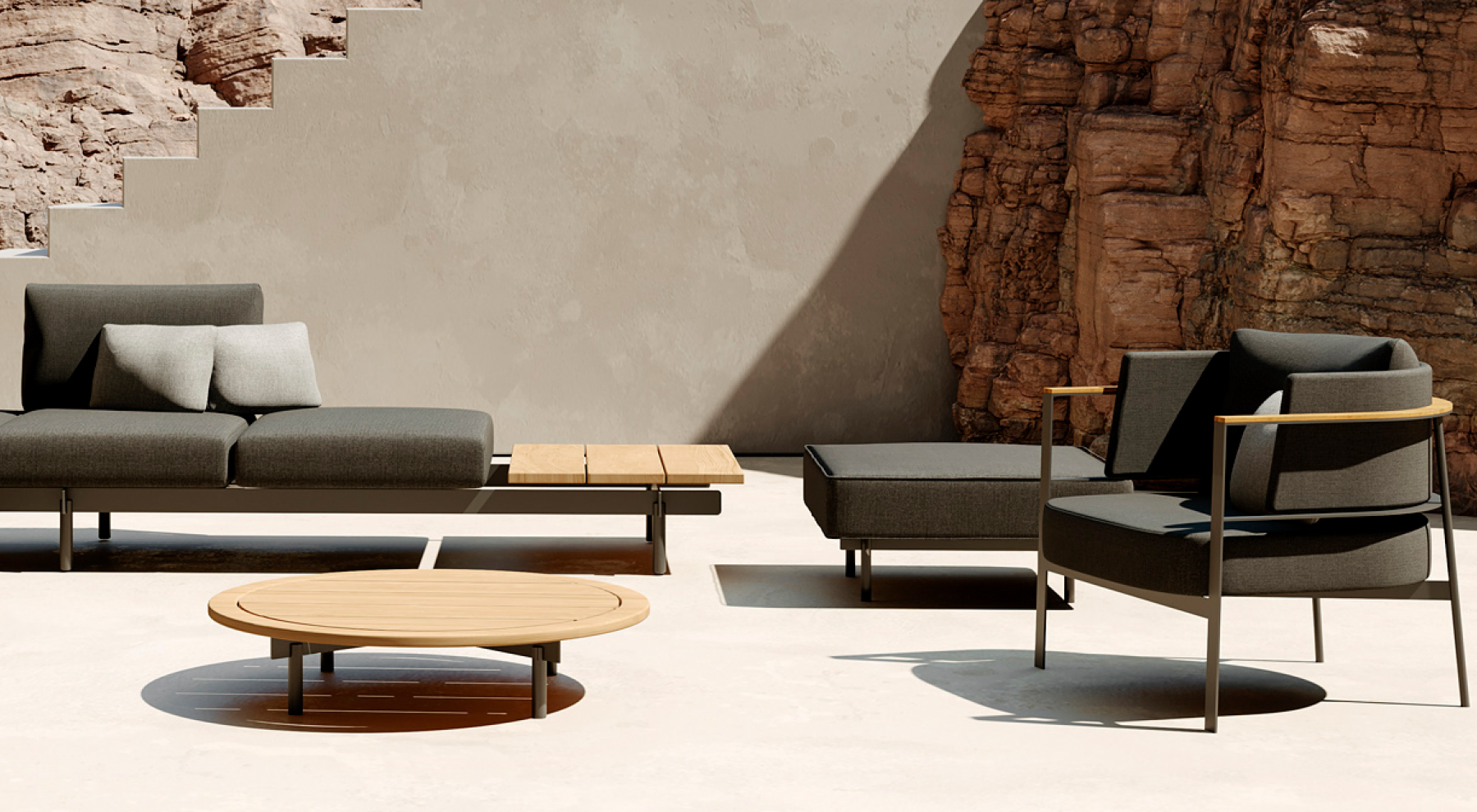 In addition the elements of the PENDA collection combine an attractive mix of materials, combining aluminium, iroko timber, solid ultra-compactedsurfaces and fabric covered parts. The armchairs and sofas include a cordedbacking structure, made by hand offering a tantalising view from any angle.