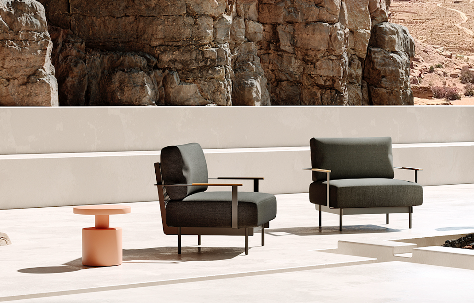 The upholstered elements of the PENDA collection with its marked rectilinear volumes underline its contemporary aesthetic, bringing a rationalist style aspect, especially for the benches and loungers.