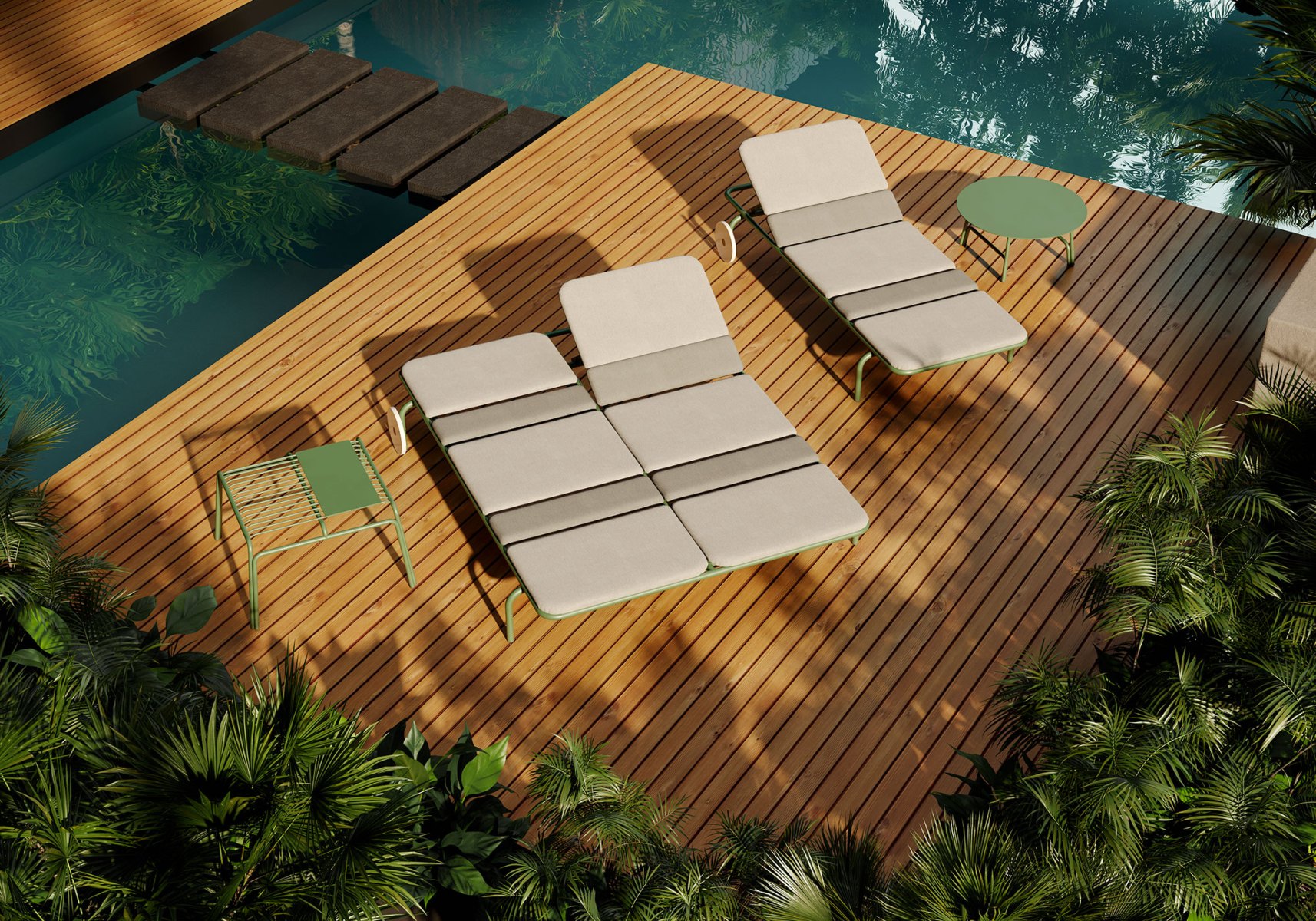 Another of its designs that is particularly suited to pools is GANDULA, a collection that represents an evolution of the traditional canvas and timber deck chairs, so evocative of the Mediterranean. Available in two versions with an Iroko timber structure or aluminium, treated specially to withstand weather conditions and made using special fabrics that are resistant to humidity and sunlight. Gandula is an informal collection, easily moved around that adapts to any style space.
