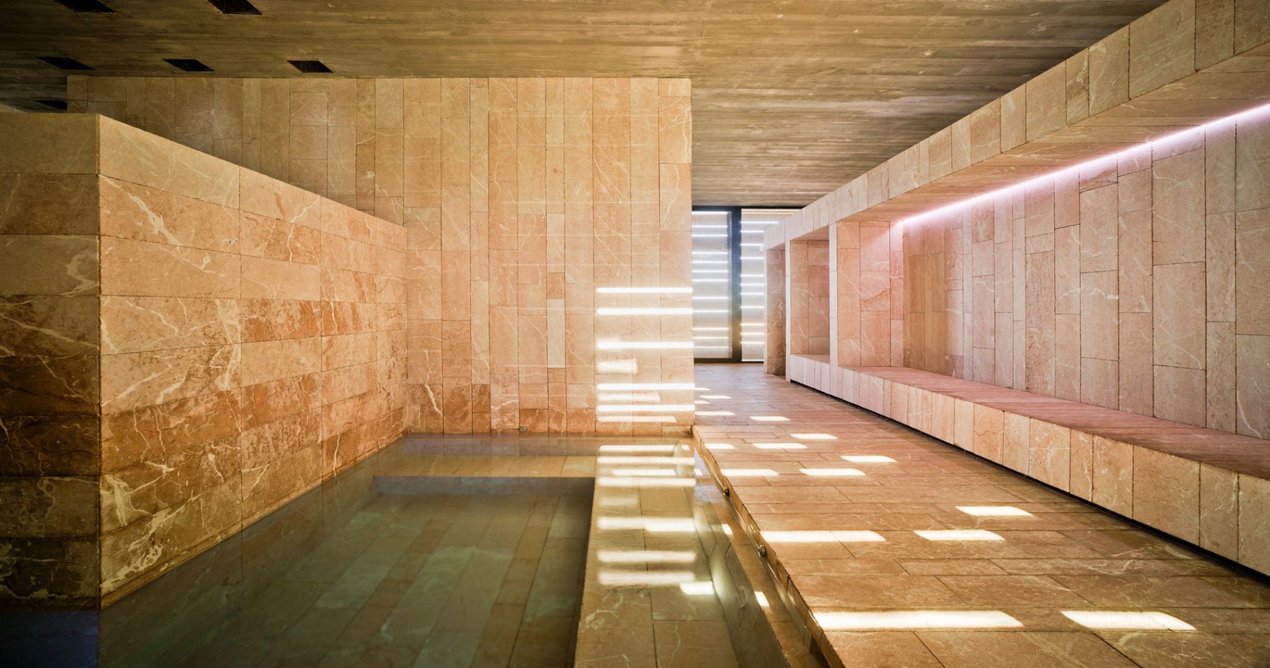 El edificio Spa está organizado a modo de hamman. Consta de dos zonas principalmente, la primera o acceso, en la que se sitúan la recepción y la cafetería; y de otra zona en la que aparecen los vestuarios y zona de aguas. Esta zona consta de un circuito continuo, donde enlazas los diferentes tratamientos; jacuzzi, chorros, burbujas, aroma-terapia, color-terapia y camas de agua
